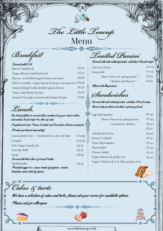 The Little Teacup in Billericay offers a delightful variety of options catering to all tastes, perfect for any time of the day. For breakfast, their Bacon Sandwich and Vegan Bacon Sandwich (ve) are sure to satisfy, alongside hearty options like Bacon, scrambled egg & beans on toast and the Toasted Bagel with double egg & cheese. Their toasted paninis, such as Cheese & Ham and Tuna Melt, offer a comforting midday bite, while the sandwich selection features crowd-pleasers like Egg Mayonnaise, Coronation Chicken, and Prawn Cocktail. For lunch, the Lunch platter for 1 combines a sandwich and slice of cake, or indulge in a warm Lasagne or classic Fish Finger Sandwich. The Ploughman's options are a treat for those seeking a balanced, savory meal, with both a Vegetarian and Traditional option available. Jacket potatoes are another satisfying choice, with toppings like Tuna mayonnaise, Mature Cheddar, and Vegan Sheese. The cake and tart selection offers a sweet finish to any meal, and the Afternoon Tea is perfect for sharing with friends, including a choice of scones and cake. Drinks range from traditional English Breakfast tea to flavored options like Vanilla and Caramel syrups, ensuring there's something for everyone. Whether you're stopping by for a cozy breakfast or indulging in a traditional afternoon tea, The Little Teacup promises a wonderful, welcoming menu full of delicious options.